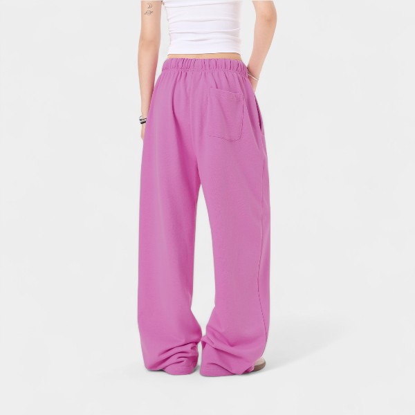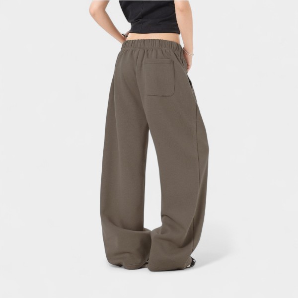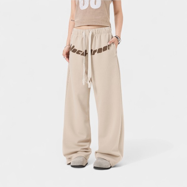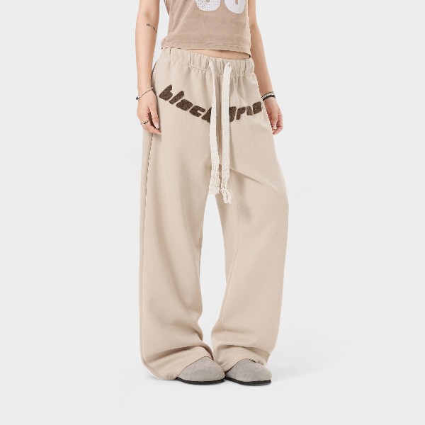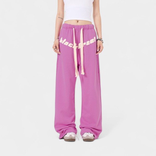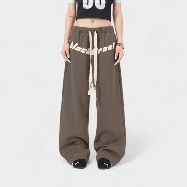 Übergroße Damen-Jogginghose mit Textdruck, Kordelzug und Taschen. Bequem und stilvoll für den Alltag oder lässige Ausflüge.