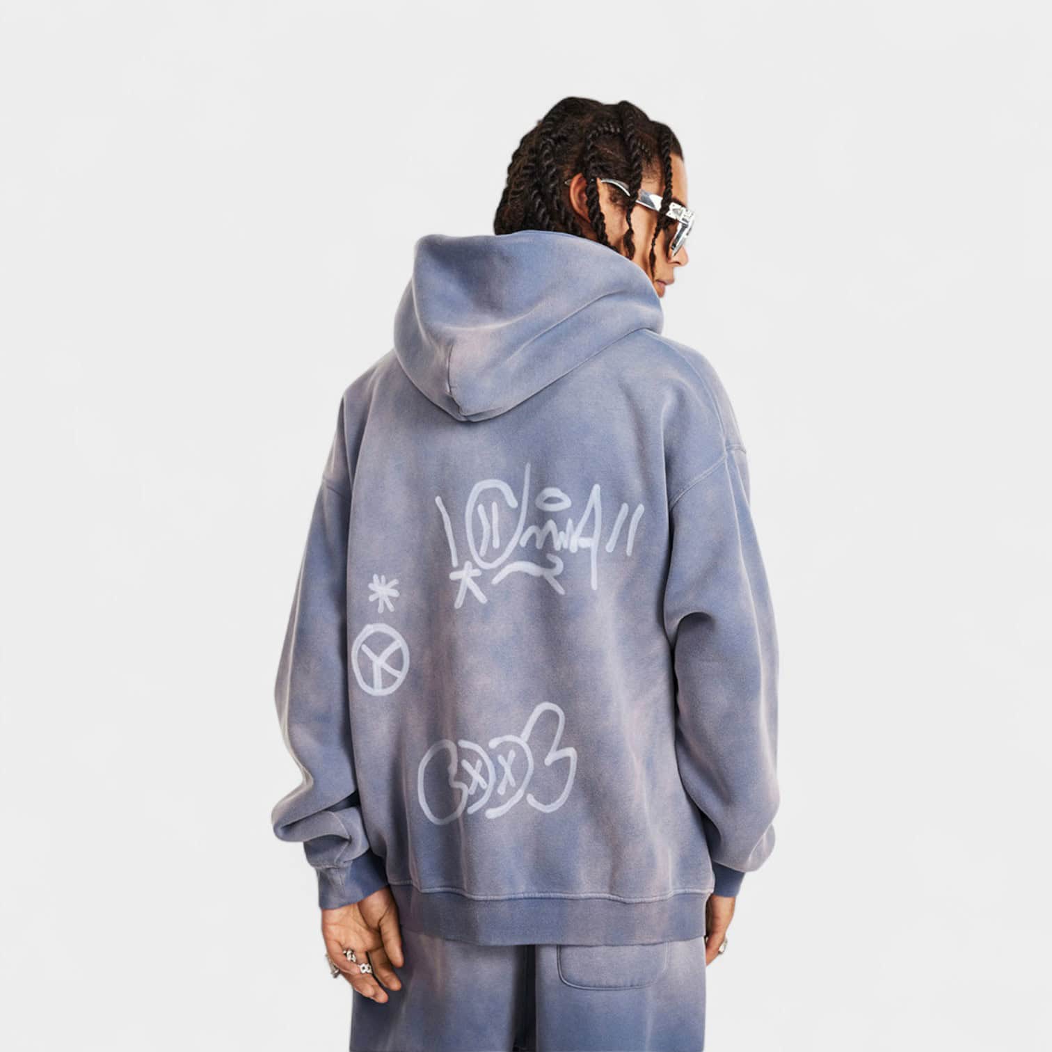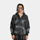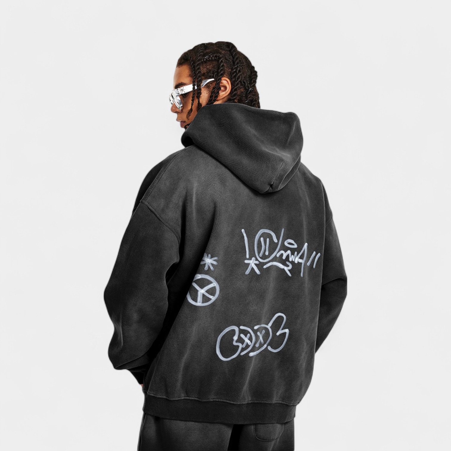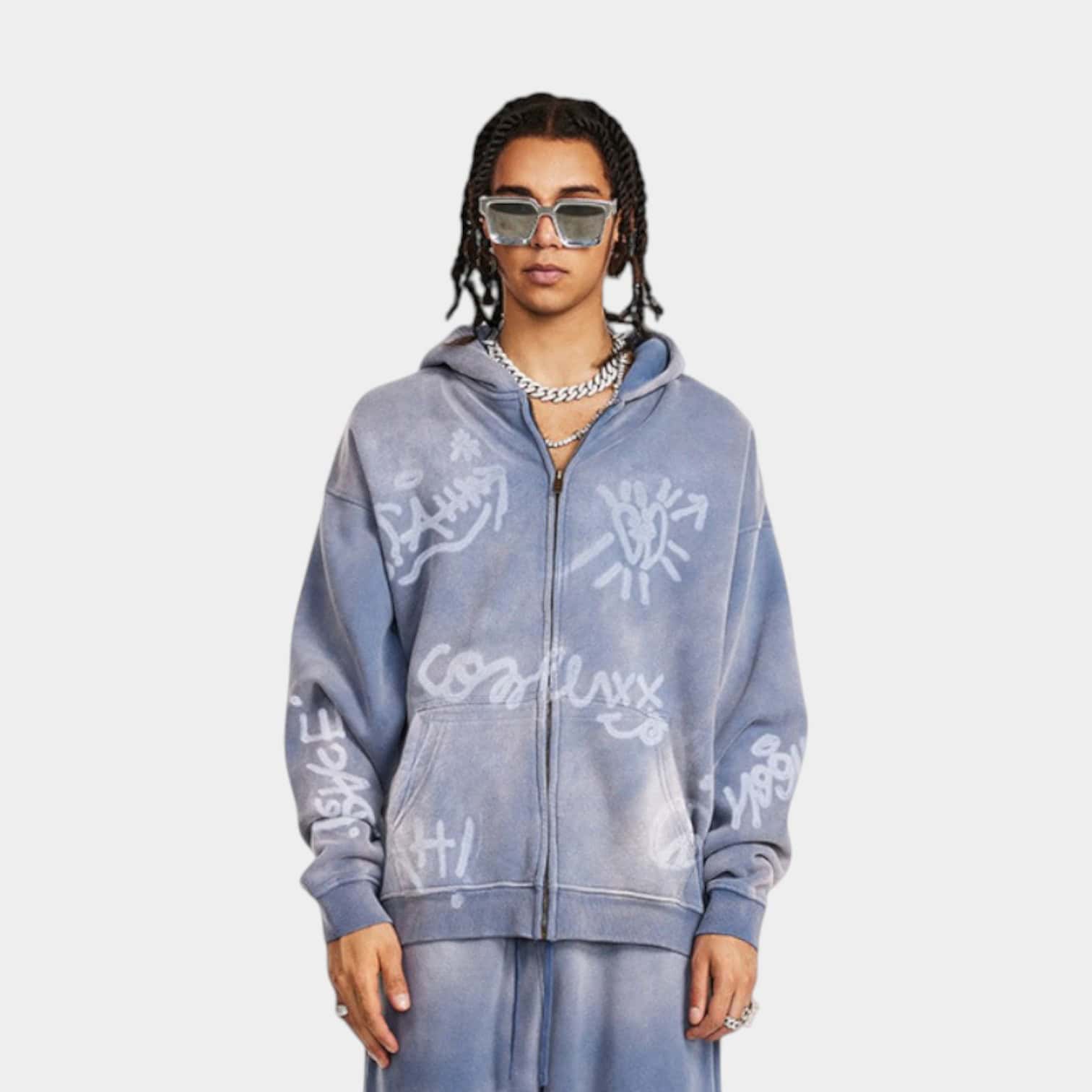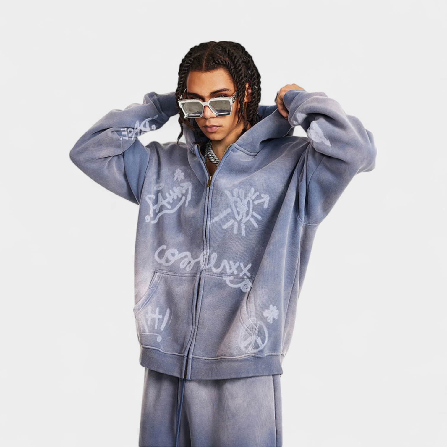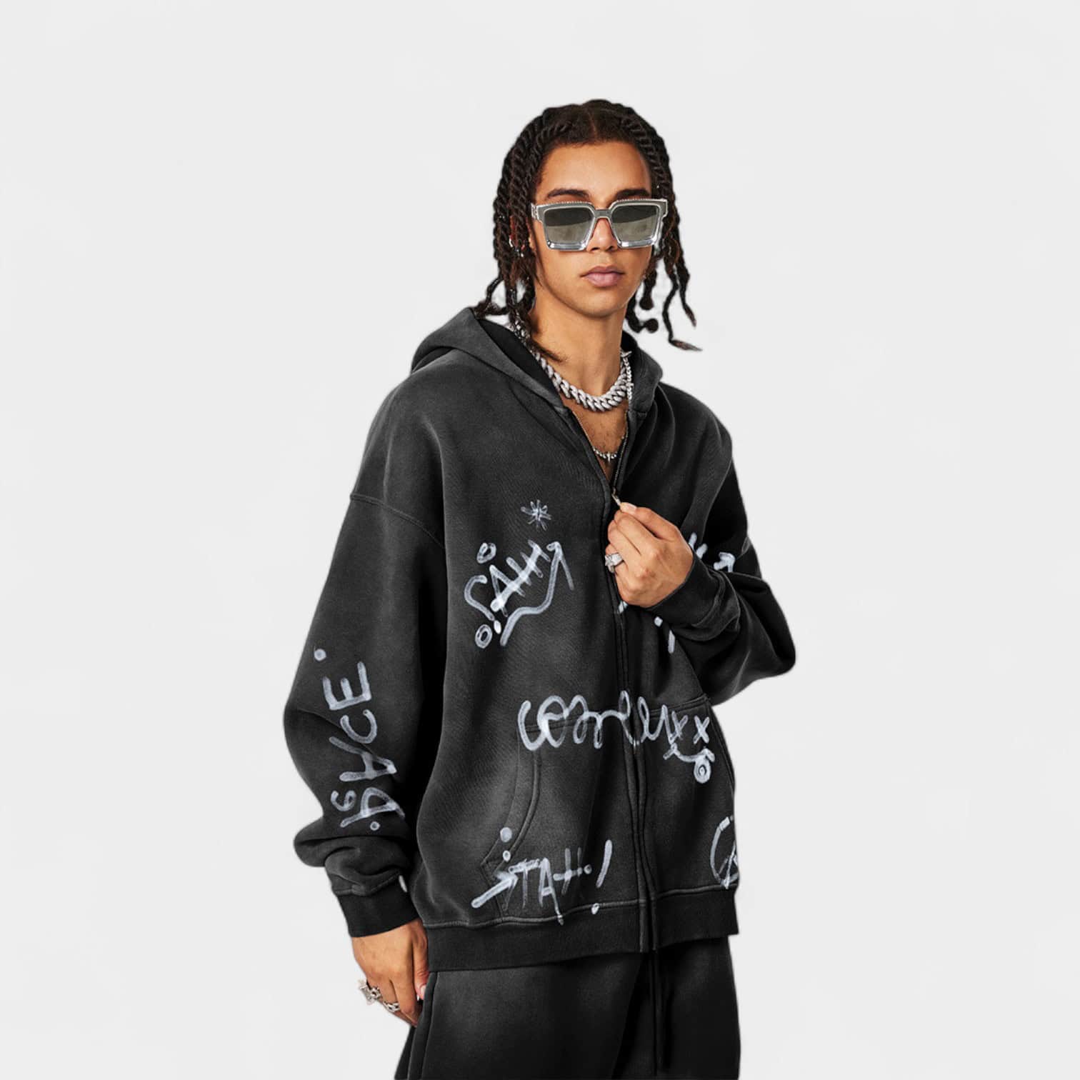Diese übergroße Herren-Jacke mit Reißverschluss und künstlerischem Aufdruck ist perfekt für bequeme Alltagskleidung und zwanglose Ausflüge.