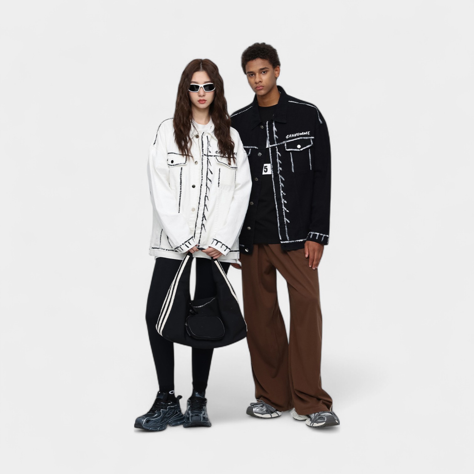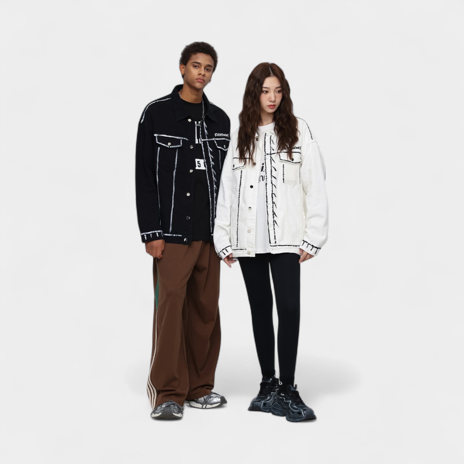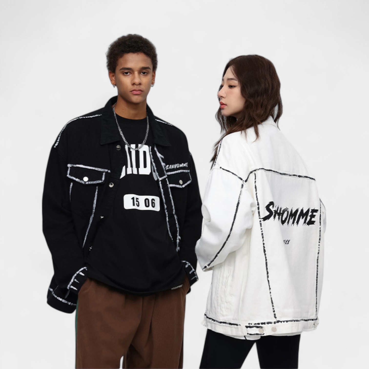 Diese vielseitige, übergroße Jeansjacke verfügt über einen Textdruck und klassische Details wie Knopfverschlüsse, Manschetten und Taschen, was sie zu einer stilvollen und bequemen Schicht für jedermann macht. Sie bietet „Oversized“ und Knöpfe für den praktischen täglichen Gebrauch.